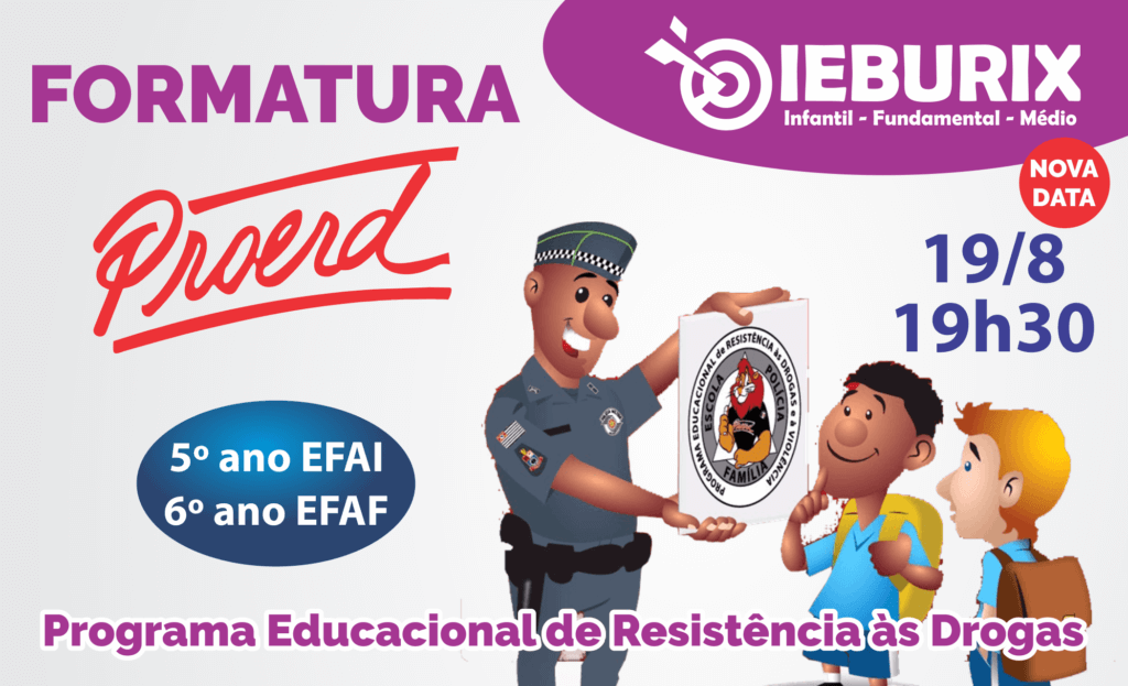 O IEBURIX, em parceria com a Polícia Militar, realizará em nosso auditório no próximo dia 24 de junho às 19h30, a 20º formatura do PROERD (Programa Educacional de Resistência às Drogas e a Violência), para as turmas de 5º ano EFAI e 6º ano EFAF.