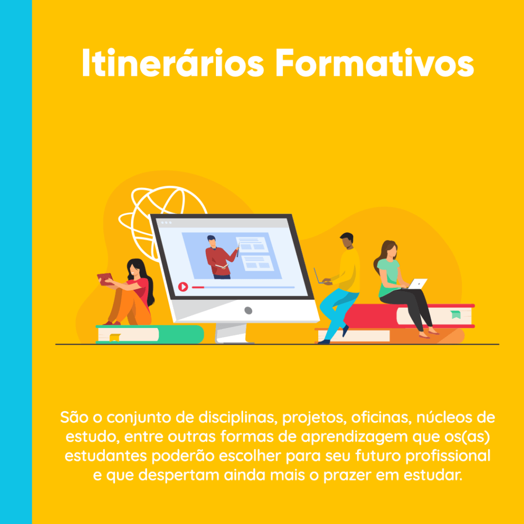 Essa carga deve ser preenchida por experiências de aprendizagem que conversem com um ou mais dos quatro eixos estruturantes. As disciplinas das áreas de conhecimento continuam pautadas pelas diretrizes da BNCC, mas em 1.800 horas.